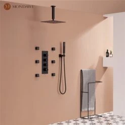 Mondawe 12-in Celling Mount Thermostatic Rain Shower System With 6 Body Jets – Black