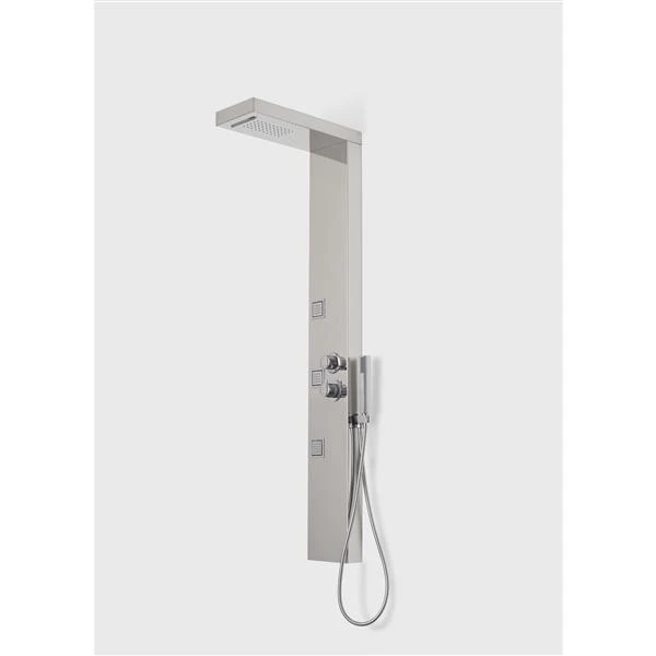 This Vista IX shower panel system by A&E Bath® features a rain shower head and thermostatic valve. One-year limited warranty.