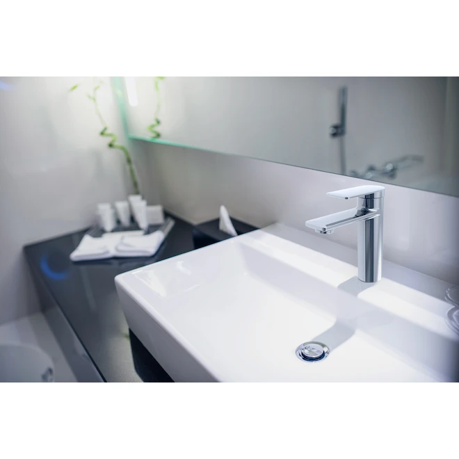- Includes supply lines, optional deck plate and push drain for simpler drain installation