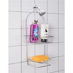 Give your shower area extra space with this wire metal bathroom rack. Crafted from metal and coated with chrome this rack offers a durable and rust-free storage use. Top shelf allows you to keep bottles such as shampoos and soaps, middle shelf for loofahs, and bottom bar for hand towels. Top part easily hangs over the shower head for an easy installation and convenient use.