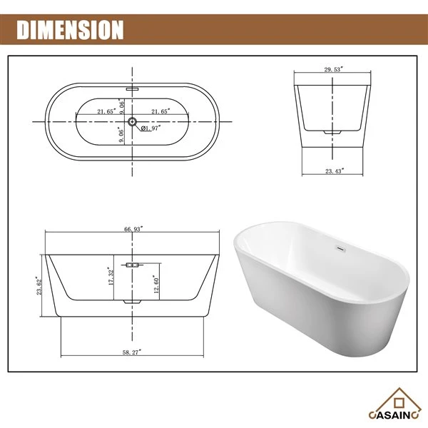 CASAINC 23.63-in X 66.93-in White Acrylic Oval Freestanding Bathtub With Center Drain