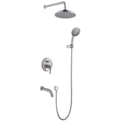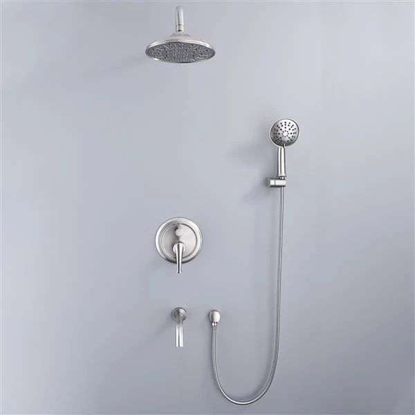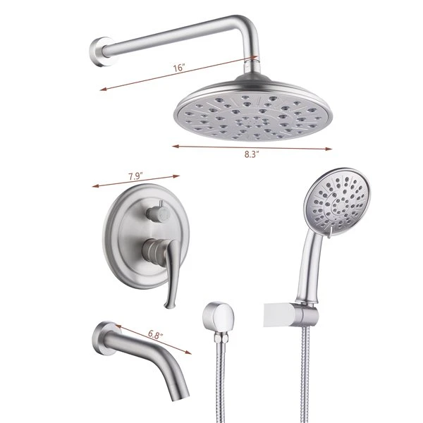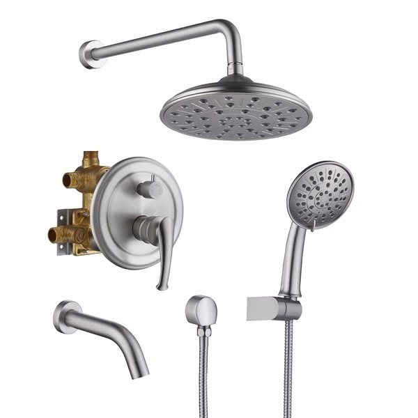 The complete shower system with 3-spray handheld shower head and single function rain shower head and tub spout. Pressure balancing valve cartridge, the valve body contains an adjustable water pressure device, this brass valve directs water flow to three showering functions, pressure-balancing valve maintains water pressure and controls temperature.