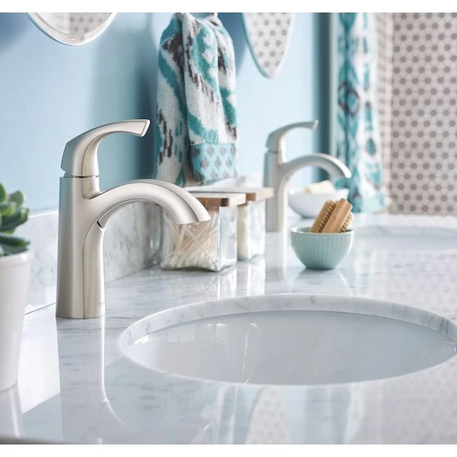 Soft curving lines and structural edges give the Lindor collection a sophisticated look that works in many transitional homes. Featuring a Duralast cartridge for generations of use and WaterSense certification for great water savings, this bathroom sink faucet combines style and reliability. Spot resist brushed nickel finish resists fingerprints and water spots while adding the warm look of stainless steel. This faucet can be installed with or without included deckplate, making this a flexible option for 1- or 3-hole sink designs. Includes 3/8-in supply lines with compression fittings attached.