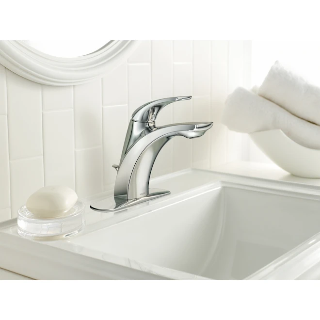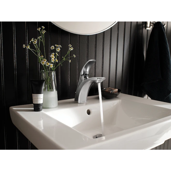 The smooth curves of this modern Zarina faucet from Moen are sure to be a hit in your bathroom. Its chrome finish is highly reflective for a mirror-like finish that’s sure to match other fixtures in your bathroom. Adjust your water flow easily thanks to a smooth single-handle lever. The faucet boasts an aerated flow that facilitates everyday tasks like brushing teeth and washing hands. This user-friendly item has a 4-inch centreset design that makes it easy to install for experts and beginners. This durable model comes with a convenient limited lifetime warranty.