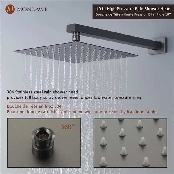 - 10-inch high pressure shower head for full-body spray even under low water pressure