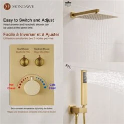 Be the first to review “Mondawe 2-Function Thermostatic Complete Shower System With Rough-In Valve – Brushed Gold” Cancel reply