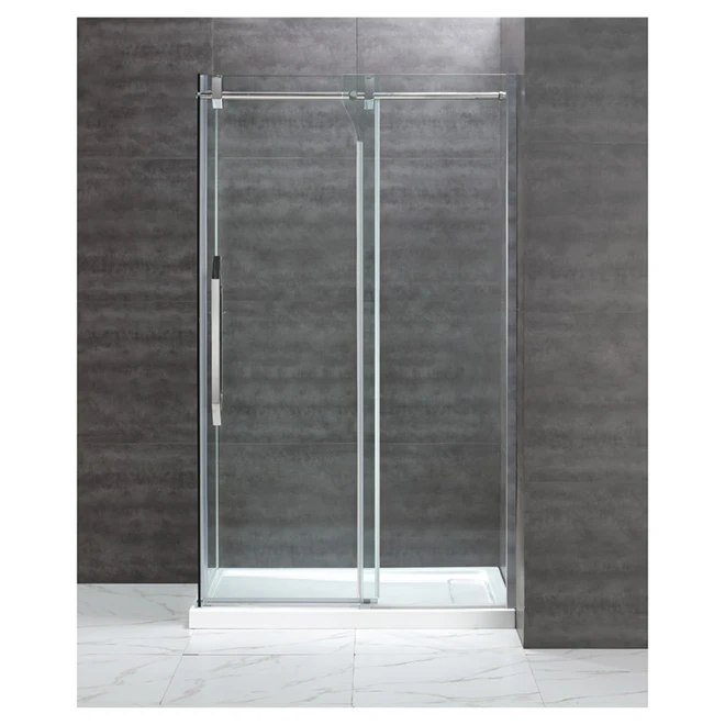 Shower door. Sliding door reversible with hidden roller system. 8 mm tempered glass. Chrome finish. Side panel and shower base sold separately. Easy installation. 5-year warranty.