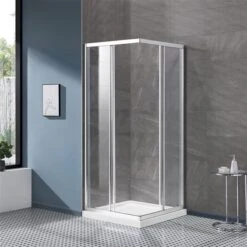 - Chrome framed shower doors and shower base for a complete corner shower installation
