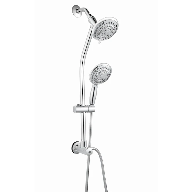 - Includes showerhead, hand shower, 6-in shower arm, flange, slidebar with cradle, diverter and hose
