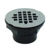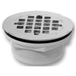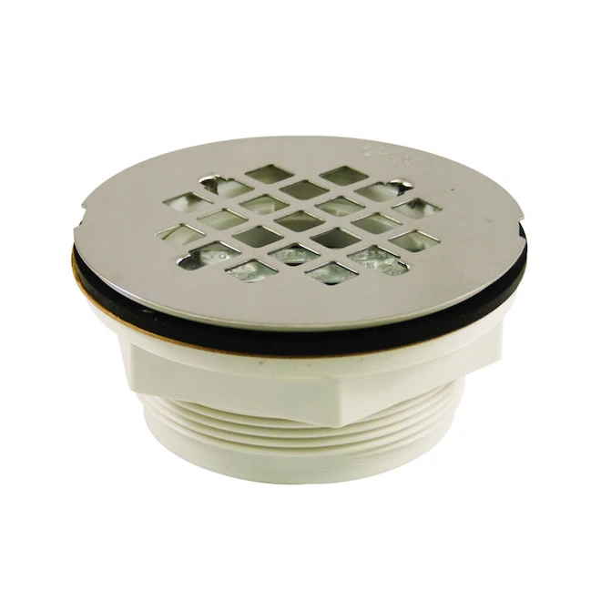 PVC shower drain. 2 in. Quick caulking, internal compression seal gasket, use on steel, fibreglass and plastic shower bases. Stainless steel finish.