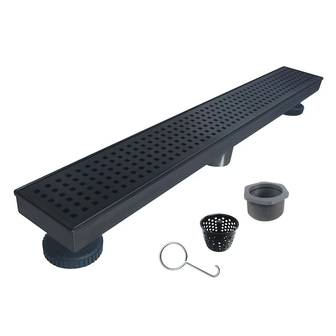 This black shower drain from Reln is made of durable stainless steel. It’s 24 inches long and has square openings that will allow water to drain out. It comes with a lifting hook, adjustable feet and other useful accessories.