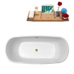 Streamline 28.3-in W X 59.1-in L White/Brushed Gold Acrylic Center Drain Freestanding Bathtub With Tray