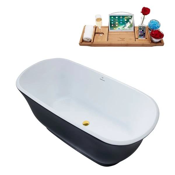 Streamline 28W X 59L Matte Black Acrylic Bathtub And A Polished Gold Center Drain With Tray