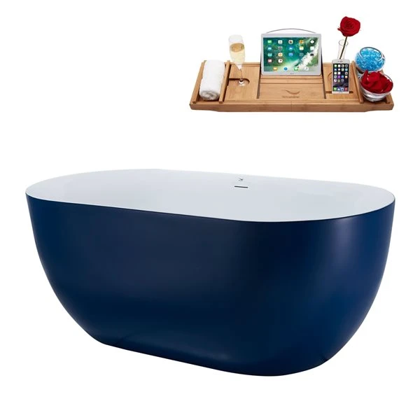 Streamline 28W X 59L Matte Dark Blue Acrylic Bathtub And A Brushed Nickel Center Drain With Tray