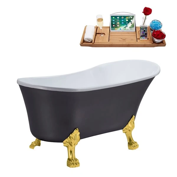 Streamline 28W X 59L Matte Grey Acrylic Clawfoot Bathtub With Polished Gold Feet And Reversible Drain With Tray