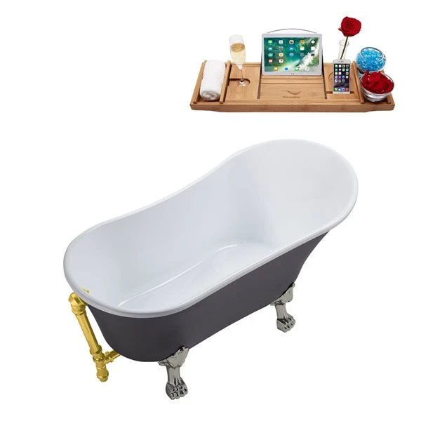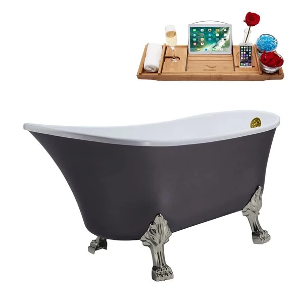 Streamline 28W X 63L Matte Grey Acrylic Clawfoot Bathtub With Brushed Nickel Feet And Reversible Drain With Tray