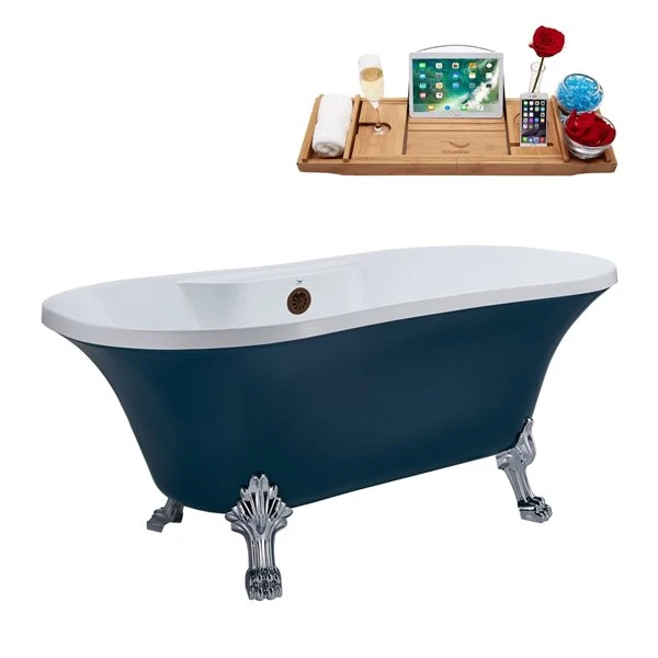 Streamline 32W X 60L Matte Light Blue Acrylic Clawfoot Bathtub With Polished Chrome Feet And Center Drain With Tray
