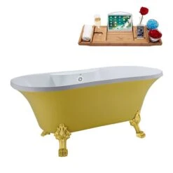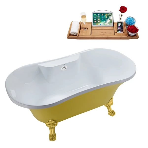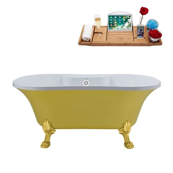 Streamline 32W X 60L Matte Yellow Acrylic Clawfoot Bathtub With Polished Gold Feet And Center Drain With Tray