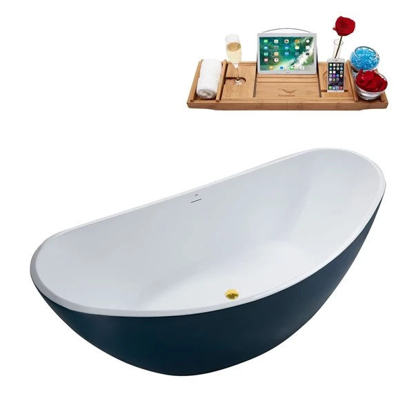 Streamline 35W X 75L Matte Light Blue Acrylic Bathtub And A Polished Gold Center Drain With Tray
