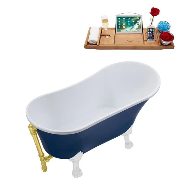 Streamline 55.1-in Blue/Brushed Gold Acrylic Oval Reversible Drain Clawfoot Bathub With Tray