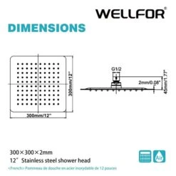 This is a 12-in ultra-thin rainfall shower head possesses a sleek and streamlined square design, meticulously crafted with 304 stainless steel for durability and reliability. It is perfect for your home shower.