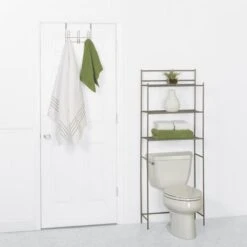 - Over-the-toilet spacesaver is easy to assemble and provides three shelves for bathroom storage