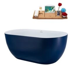 Streamline 28W X 59L Matte Dark Blue Acrylic Bathtub And A Glossy White Center Drain With Tray